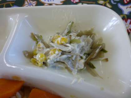 ごぼう、きゅうり、コーンが入ったサラダです。食べる時に小袋のマヨネーズをかけて食べます。