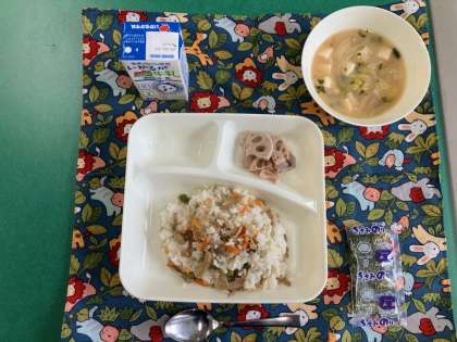 鶏ごぼうご飯【きざみのり】、みそ汁、焼きれんこん、ご飯、牛乳