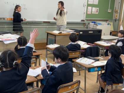 「バス停に人が並んでいます。○○さんの前に6人います。後ろに4人並んでいます。みんなで何人並んでいますか。」