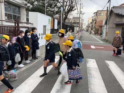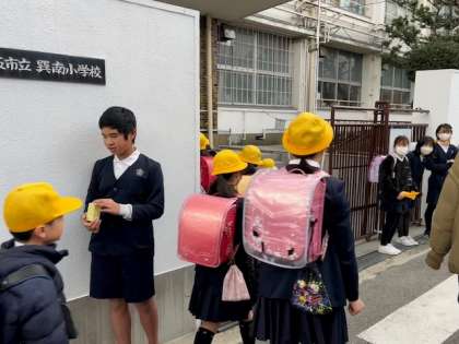 「赤い羽根募金」が始まり、児童会の子どもたちが募金箱を持ち、門に立ってくれています。