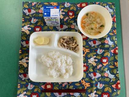 豚肉と干しずいきのみそ煮、五目汁、焼きじゃが、ごはん、牛乳