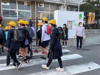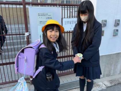 登校してきた児童が、「赤い羽根共同募金」に協力してくれました。