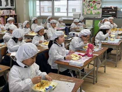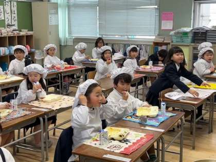 1年生の子どもたちが、おいしそうに「チキンカレーライス」を食べています。