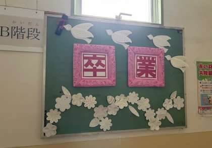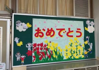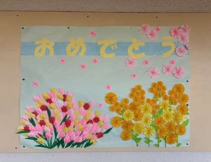 保健室前、給食室前、階段踊り場の「おめでとう」です。