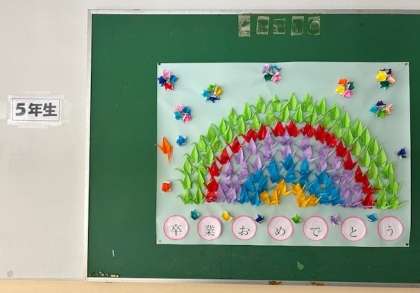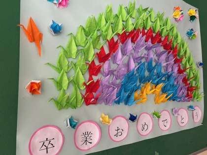 5年生からのお祝いは、色とりどりの「鶴」でデザインされています。