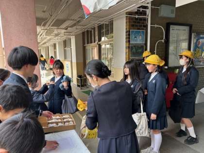 登校してきた卒業生が、在校生からコサージュをつけてもらっています。