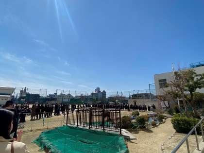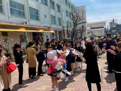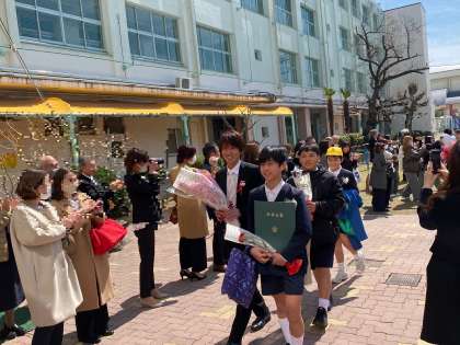 卒業生が、担任の先生の先導で、在校生・保護者・来賓・教職員がつくる「花道」を歩いています。