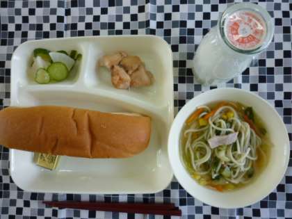 焼き豚、チンゲンサイ、コーンの入ったラーメンです。児童に大人気のメニューです。