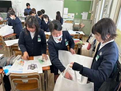 1組の子どもたちが、今年つくった絵画などの図工の作品、書写の作品などを、作品袋に入れていました。