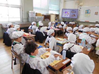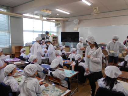 1年生の教室をのぞいてみると、6年生が手際よく配膳してくれていました。6年生ありがとう。
