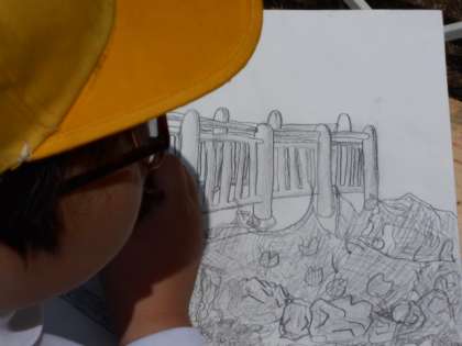 教室で鉛筆デッサンの技法を学んだ後、自分の思い思いの場所を決めて描き始めたようです。あっという間に時間が過ぎ、続きは次回だそうです。完成が楽しみです。