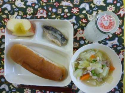 あじのレモンマリネ、スープ煮、りんご、レーズンパン、牛乳