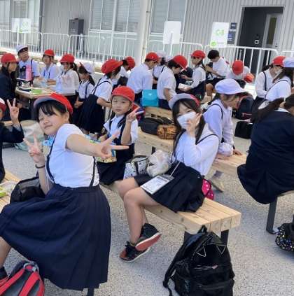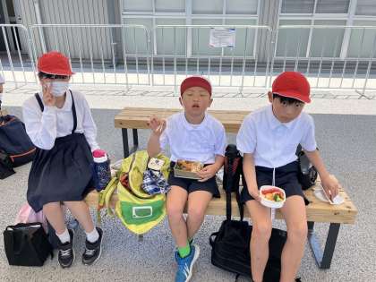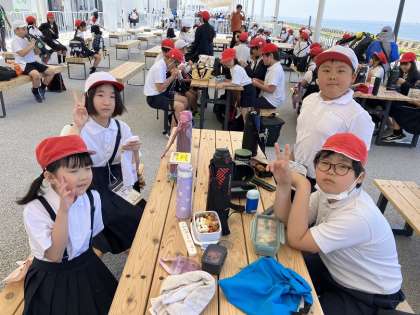 大阪湾を見ながら、たてわり班でのお弁当タイムは、