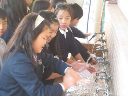 休み時間が終わり、子どもたちは手洗い場に集まります。少し時間はかかりますが「手洗い」「うがい」をしっかりのとやろうとしています。この習慣を続けてほしいです。