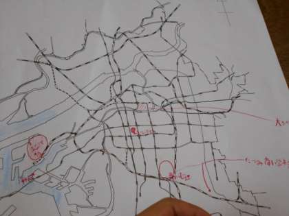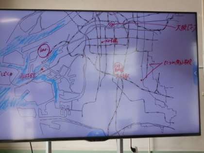 大阪市の白地図に自分たちの行ったことのある場所を書き込んでいました。