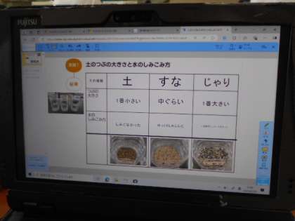 3か所から採った砂や土をペットボトルで作った実験装置に入れ、水を上から入れると・・・予想通りではあったようですが、それでも目の前で結果を見ることができすっきりしたようです。