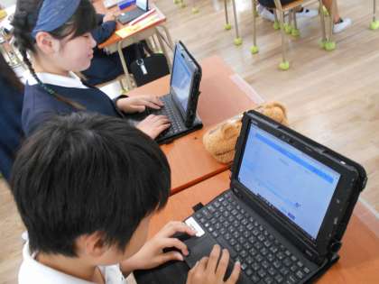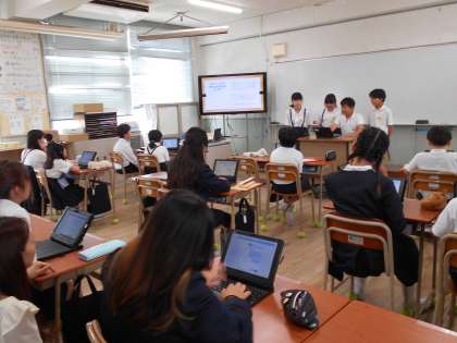 今日の学習参観は社会の「世界の食について」調べ、パワーポイントにまとめたものを発表しました。世界の食や国旗の意味について発表し、他の班の発表を聞いて、よかったところを「気づきメモ」に打ち込み、皆で共有しました。