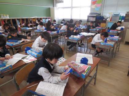 1年2組の子どもたちは、時計の学習をしていました。自分の時計でたしかめながら練習問題をしていました。