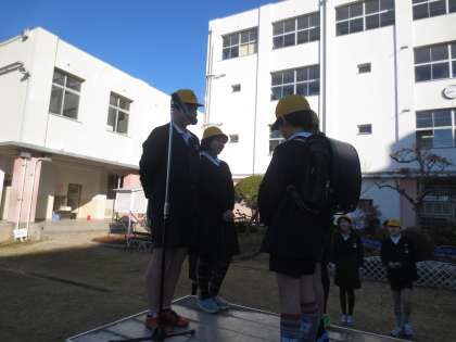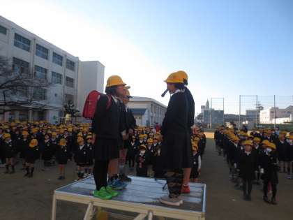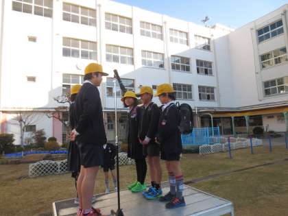 児童会代表が朝の登校時の「あいさつ」の仕方を演じて、朝、みんなが元気よく「あいさつ」ができるように呼びかけていました。