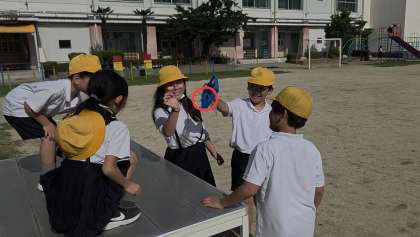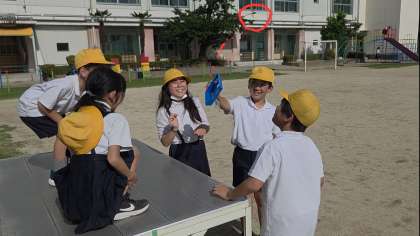 先々週の理科の時間にプールでヤゴを見つけました。そして今日、そのヤゴが羽化し、立派なトンボの成虫になりました。放課後に5年生児童とトンボの飛び立ちを見届けました。