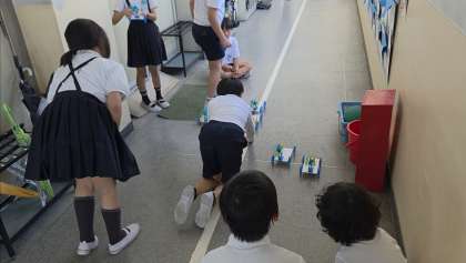 「どうしてプロペラが回らないのか。」「どうして後ろに進むのか。」「もっと速く走らせるにはどうするとよいのか。」といった疑問に児童一人ひとりが向き合い、試行錯誤を重ねていました。