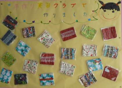 手作り実習クラブの子どもたちが、2学期からティッシュカバーを作っていました。レースをつけたり、かざりをつけたりして、とてもかわいく出来上がりました。全員完成したので、1Fの掲示板に飾りました。