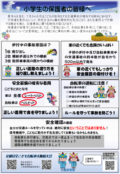 保護者の皆様方におかれましては、ご家庭において、本紙記事を参考にして繰り返し交通安全について注意喚起し、お子様と共に事故の無い楽しい夏休みをお過ごしください。