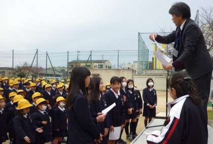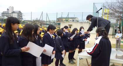 バドミントンクラブの人たちが、12月に交歓試合に行き、勝ち残った1チームは2月にも試合に行ってきました。その時の表彰状が届き、今日の朝会で、校長先生から表彰状をいただきました。