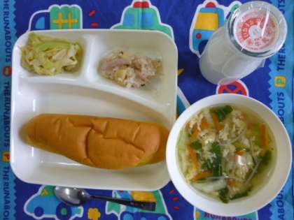 中華おこわ、卵スープ、キャベツのオイスターソースいため、パンプキンパン、牛乳