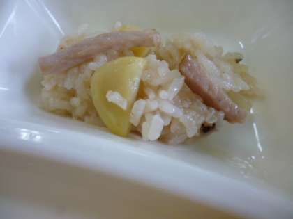 焼き豚、くり、しいたけなどが入ったおこわです。もち米でもちもちとした仕上がりになっています。