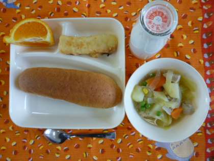 いかてんぷら、洋風煮、デコポン、ライ麦パン、牛乳