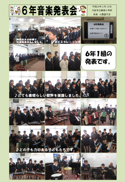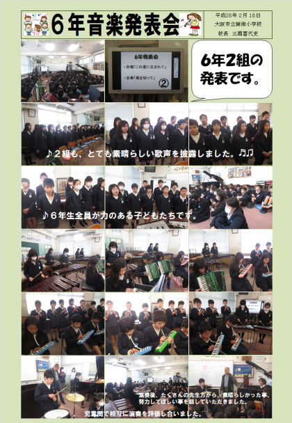 2/18(木)梅崎先生の指導で、6年生が音楽発表会をしました。とても素晴らしい歌声と合奏を披露してくれました。