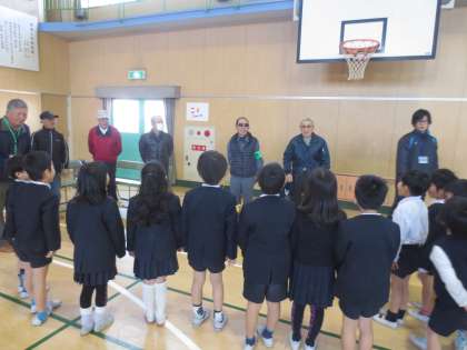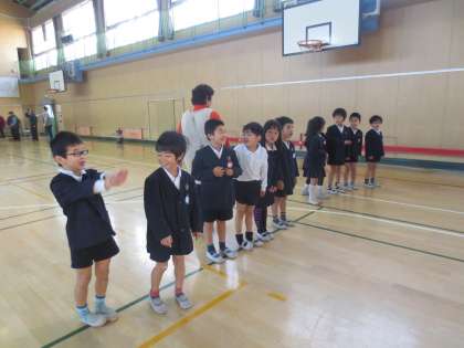 地域の「元気クラブ」の方々に、四つの昔遊びコーナーの指導をしていただきました。とてもやさしい地域のおばあちゃん、おじいちゃんに、1年生は元気よくご挨拶をしていました。元気クラブ会長 藤原武司さん、元気クラブ女性部長 有村清子さんら22名の方々に指導をしていただきました。