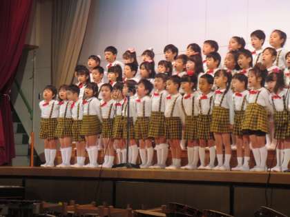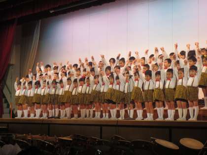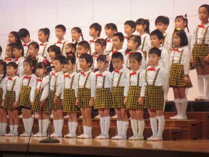 プログラムの5番は、ばら・ふじ・こすもす組の合唱(Eency Weency Spider・ゆうきのうた・手をつなごう)です。さすが年長です。姿勢も歌声も心に響きとてもよかったです。会場の方々は、演技に大きな拍手をされていました。