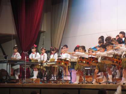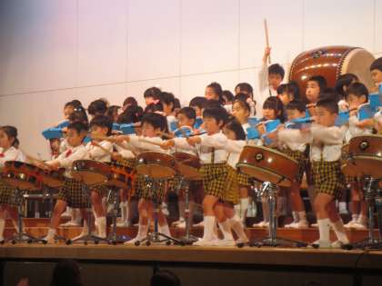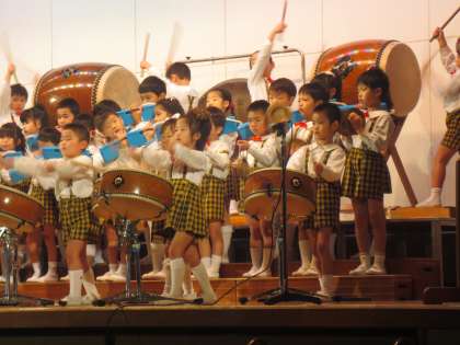 ばら・ふじ・こすもす組の合奏二曲目(ジェームズボンドのテーマ)です。和太鼓を上手に演奏し迫力満点の合奏でした。
