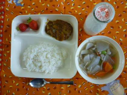 カレーハンバーグ、根菜たっぷりスープ、いちご、ご飯、牛乳