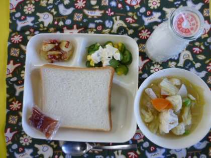 鶏肉と野菜のスープ煮、野菜サラダ、ジャーマンポテト、食パン、いちごジャム、牛乳
