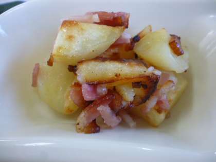 ベーコン、じゃがいもを塩、こしょうで味つけし、焼き物機で焼いています。
