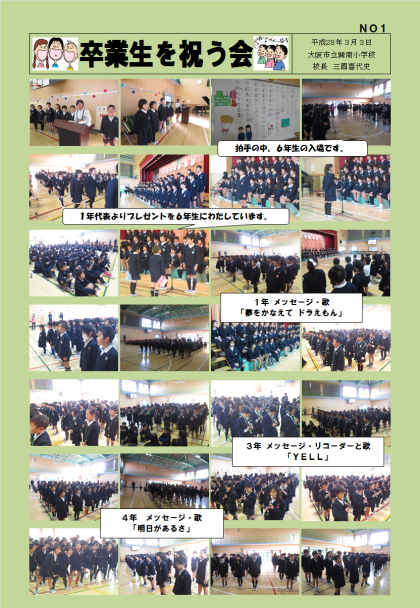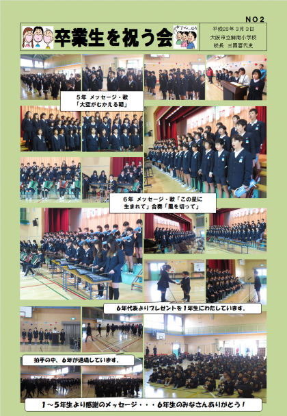 1年生〜5年生の在校生が、卒業していく6年生に、心温まる歌と感謝のメッセージを伝えました。また、在校生から6年生にプレゼントをわたしました。