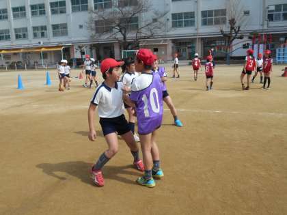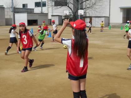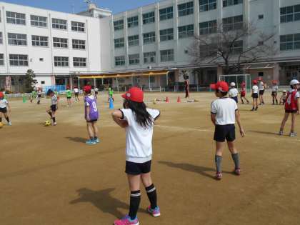 テンポのよい音楽を流し、サッカーの動きを高めています。音楽のリズムに合わせて、気持ちも楽しくなっているようです。