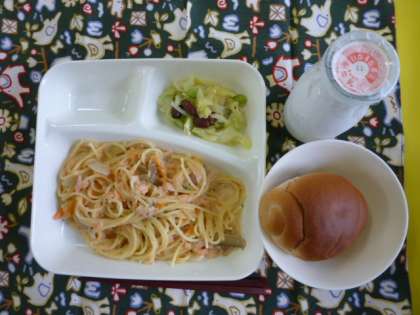 さけのクリームスパゲッティ、ビーンズサラダ、黒糖パン小、牛乳