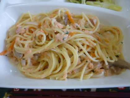 紅ざけのフレークとベーコンを主材にしたクリームスパゲッティです。
