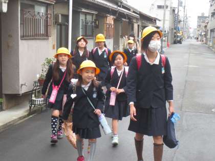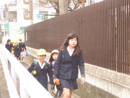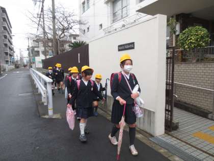 集団登校は6年〜4年の班長・副班長が、みんなに声をかけて安全に歩いています。班長・副班長がリーダーシップを発揮することは大切ですが、みんなが協力してこそ安全な登校ができます。