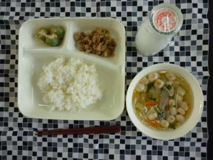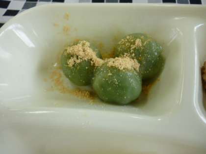 豚肉のごまいため、すまし汁、きな粉よもぎだんご、ご飯、牛乳