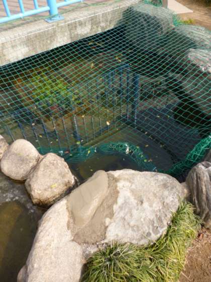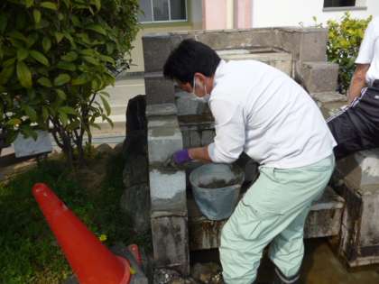 滝からの流れがはやく、メダカがたくさん暮らしている小川があふれていました。そこで、セメントブロックで滝の両側を高くし、小川のふちをセメントでかさ上げする工事をしています。