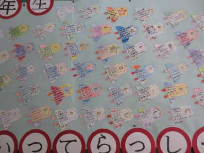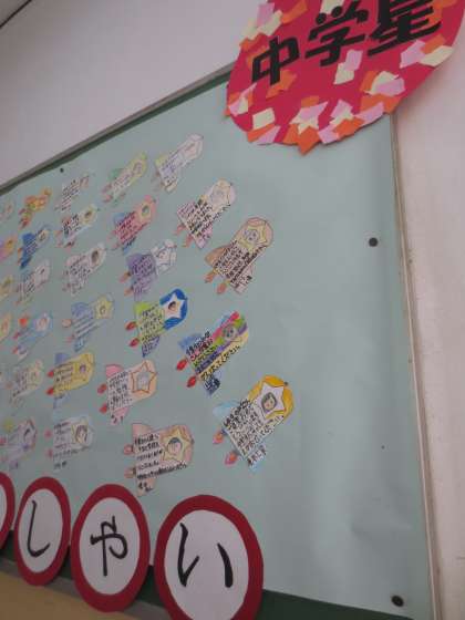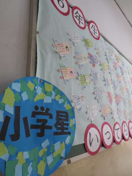 3階の廊下掲示板に4年生のメッセージがはられています。小学星〜中学星へロケットに乗って旅立つ6年生に、心優しいはげましの言葉が書かれています。