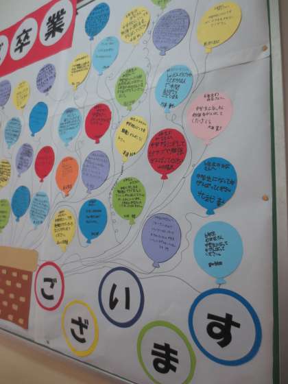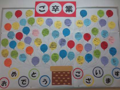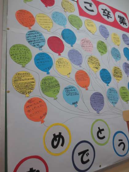 3階の廊下掲示板に3年生のメッセージがはられています。風船に心温まるメッセージが書かれています。6年生は大空高く飛び立っていってくれるでしょう。