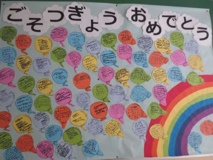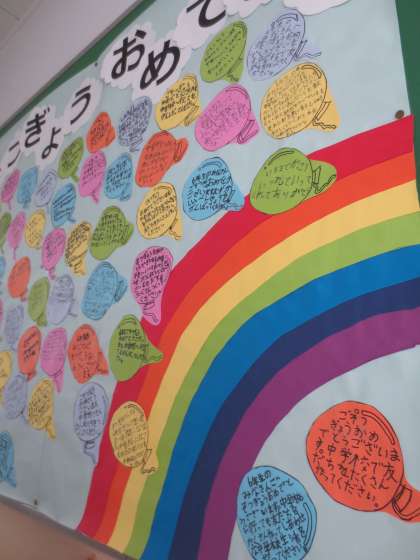 2階の廊下掲示板に2年生のメッセージがはられています。お姉さん、お兄さんへの心温かな言葉が書かれています。