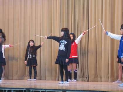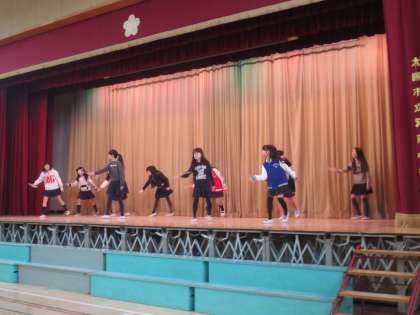 発表を終え、バトン&ダンスクラブの部長さんがあいさつをしています。みていた児童全員で拍手のお礼をしました。
