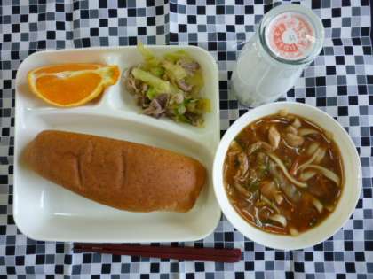 みそきしめん、豚肉と野菜のいためもの、デコポン、ライ麦パン、牛乳